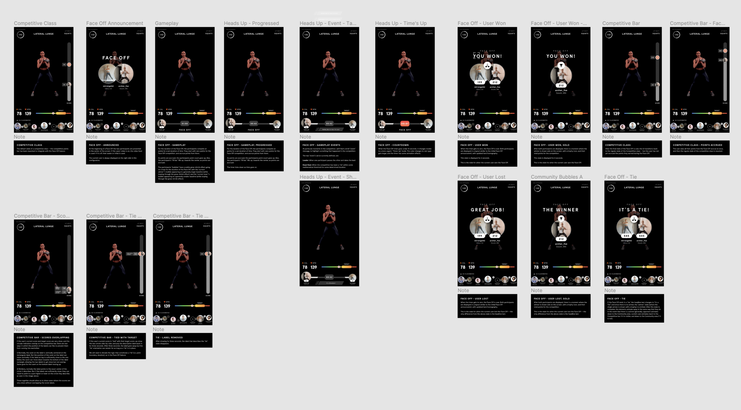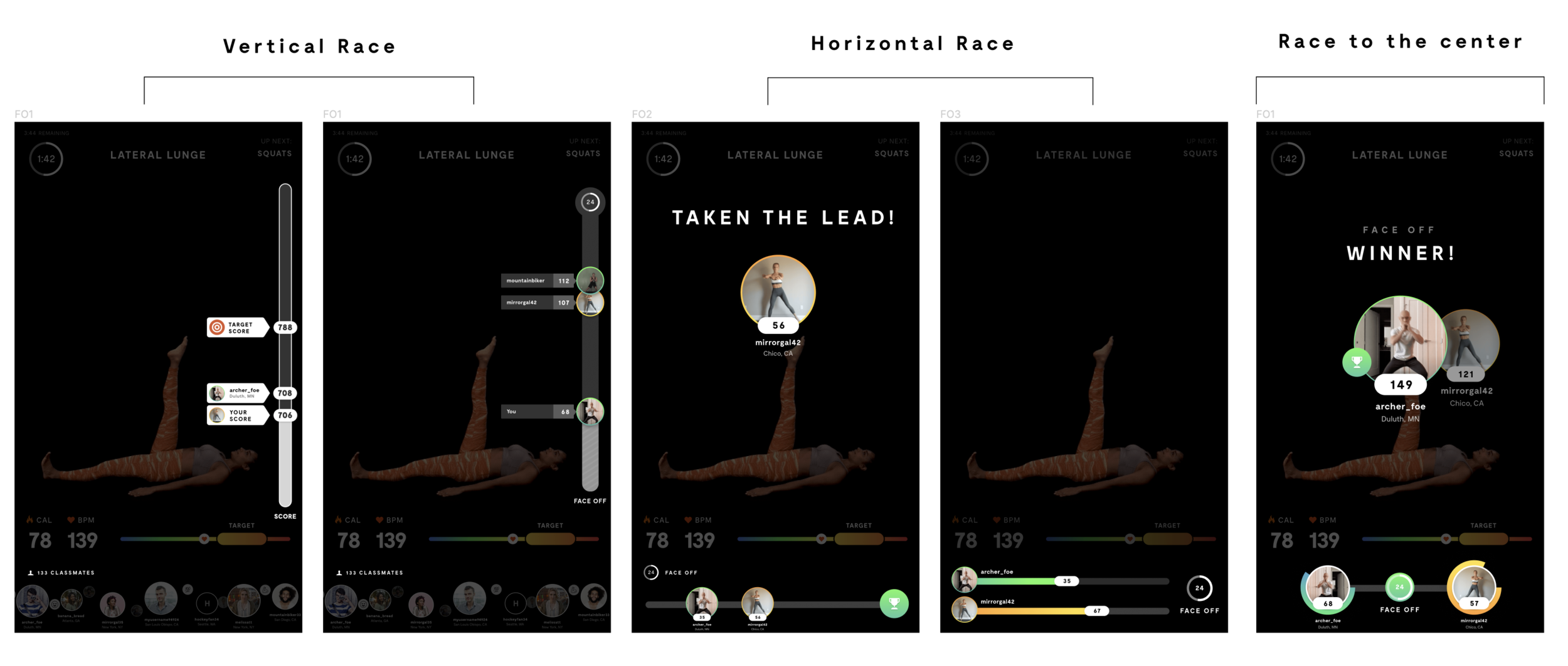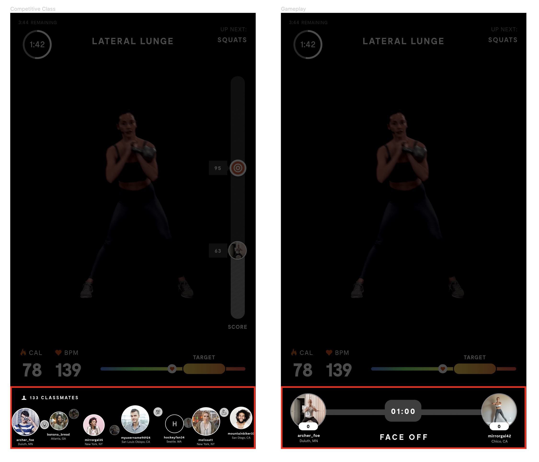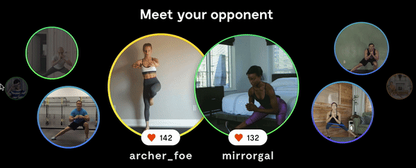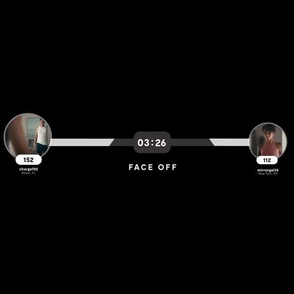 Since Face Off is designed to bring people together in their workout experience, I decided to utilize the space we already had for classmates and use that as our playing field. This way users will continue to associate the bottom of the Mirror as a place for all things related to people and competition.